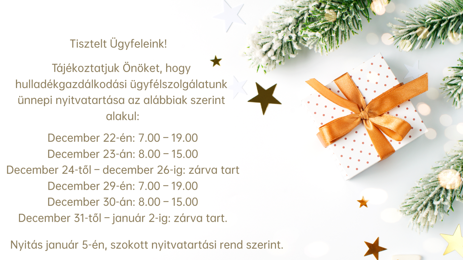 Tájékoztatjuk Önöket, hogy az Erdei Iskola úti hulladéklerakó és a Körmendi úti hulladékudvar 2025. december 4-én, csütörtökön 15:00 óráig tart nyitva, továbbá az Újrahasználati Központ ezen a napon zárva tart.