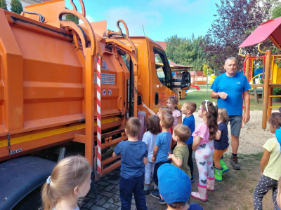 Kósa Csaba gépjárművezető és Döbrössi László hulladékgyűjtő segédmunkás kollégáink az IVECO típusú tömörítőlapos „kis kukás autónkat” mutatták be az apróságoknak, akik a vezetőfülkébe is beülhettek.