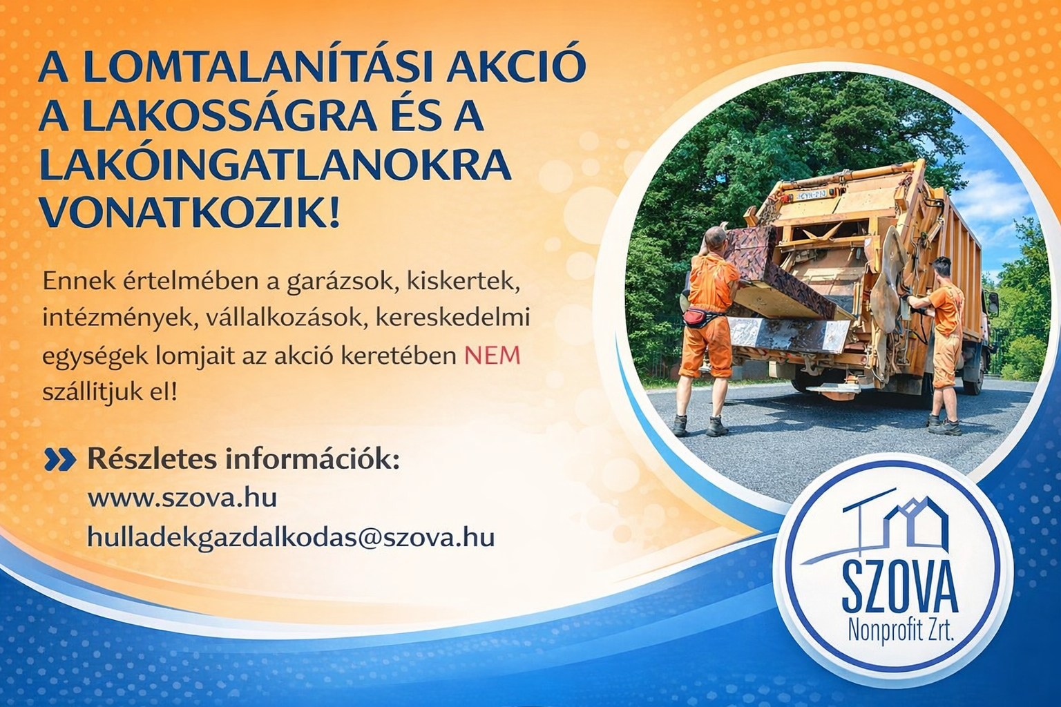 Arra buzdítjuk a lakosságot, hogy mielőtt valamit kidobásra ítélne, gondolja át, hogy valaki másnak nem válna-e hasznára az adott holmi és amennyiben igen, gondoskodjon a tovább adásról (akár a SZOVA Nonprofit Zrt. Újrahasználati Központjában is leadhatja). Ami megmenthető, másnak jól jöhet, nem utolsó sorban a környezetet is kíméljük, ha kevesebb hulladékot termelünk.