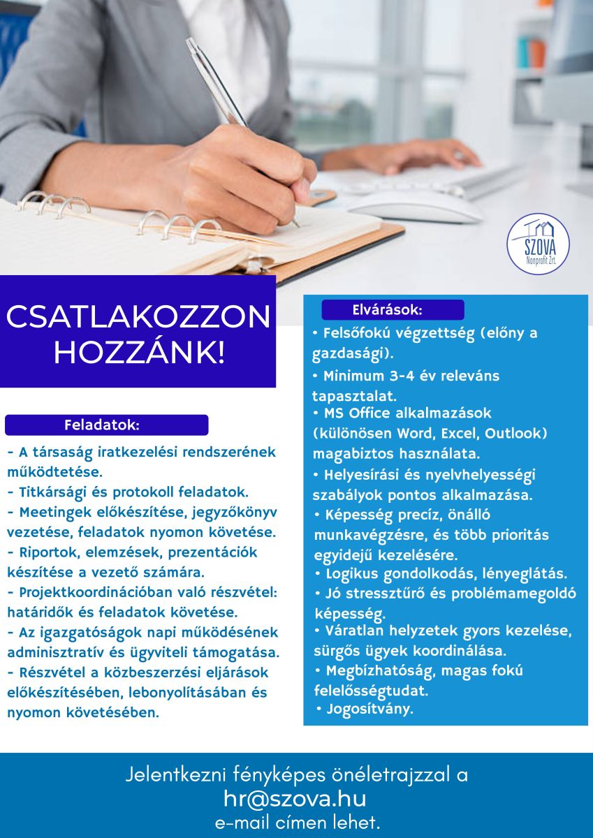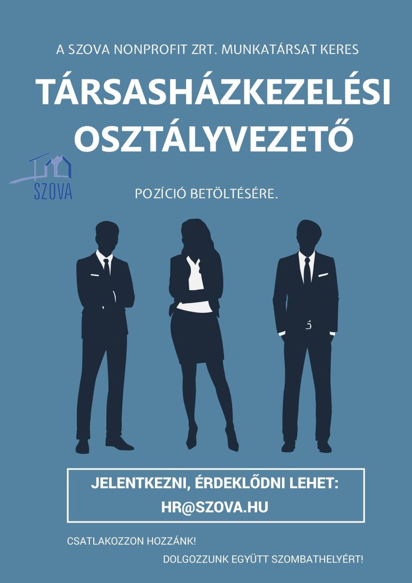 A SZOVA Nonprofit Zrt. munkatársat keres az alábbi pozíció betöltésére: társasházkezelési osztályvezető.