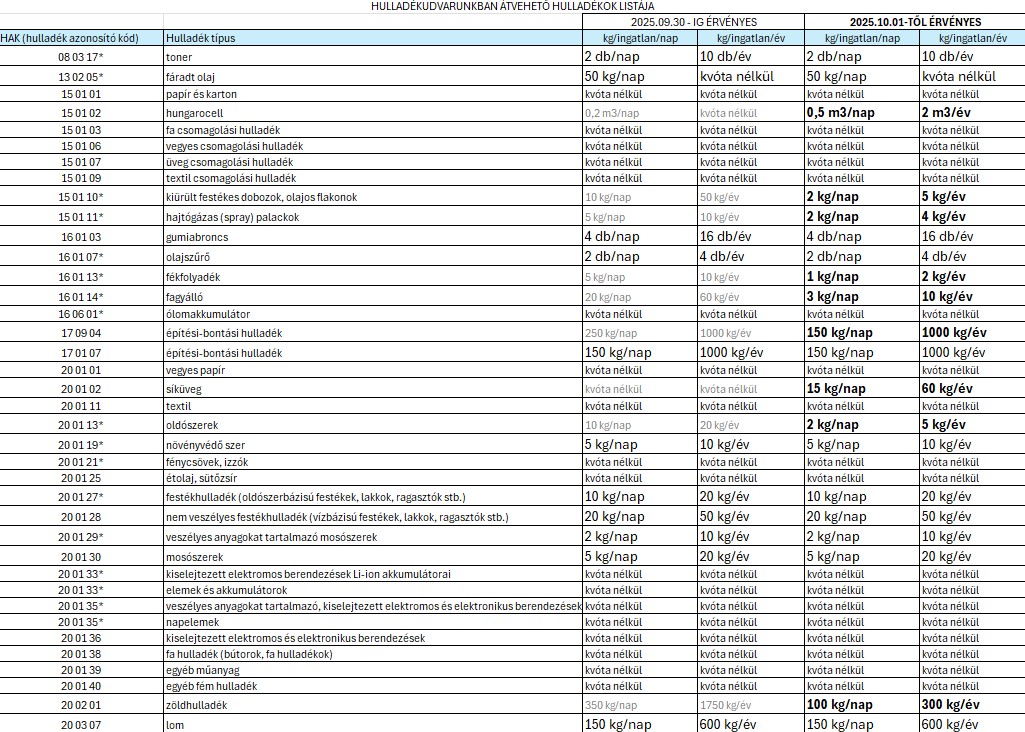 - leadás a Hulladékudvarban (lenti táblázat szerint)