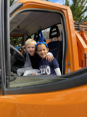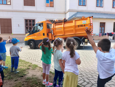 Kósa Csaba gépjárművezető és Döbrössi László hulladékgyűjtő segédmunkás kollégáink az IVECO típusú tömörítőlapos „kis kukás autónkat” mutatták be az apróságoknak, akik a vezetőfülkébe is beülhettek.